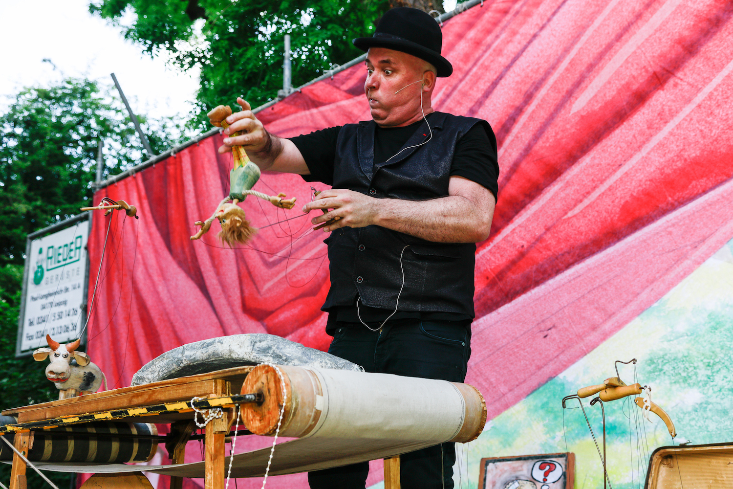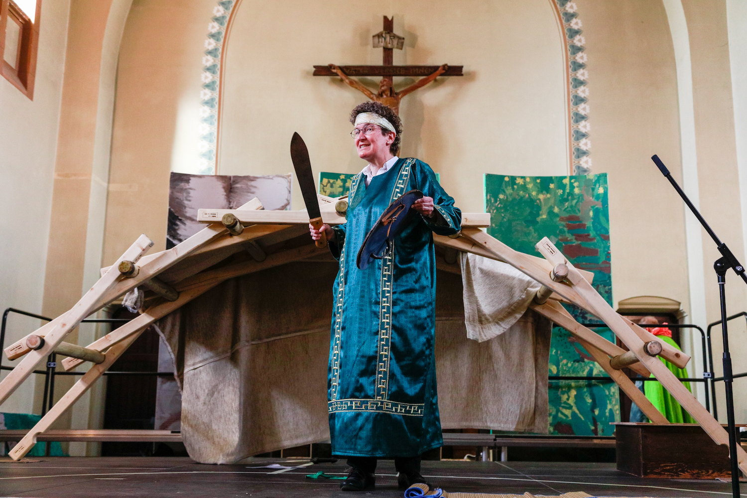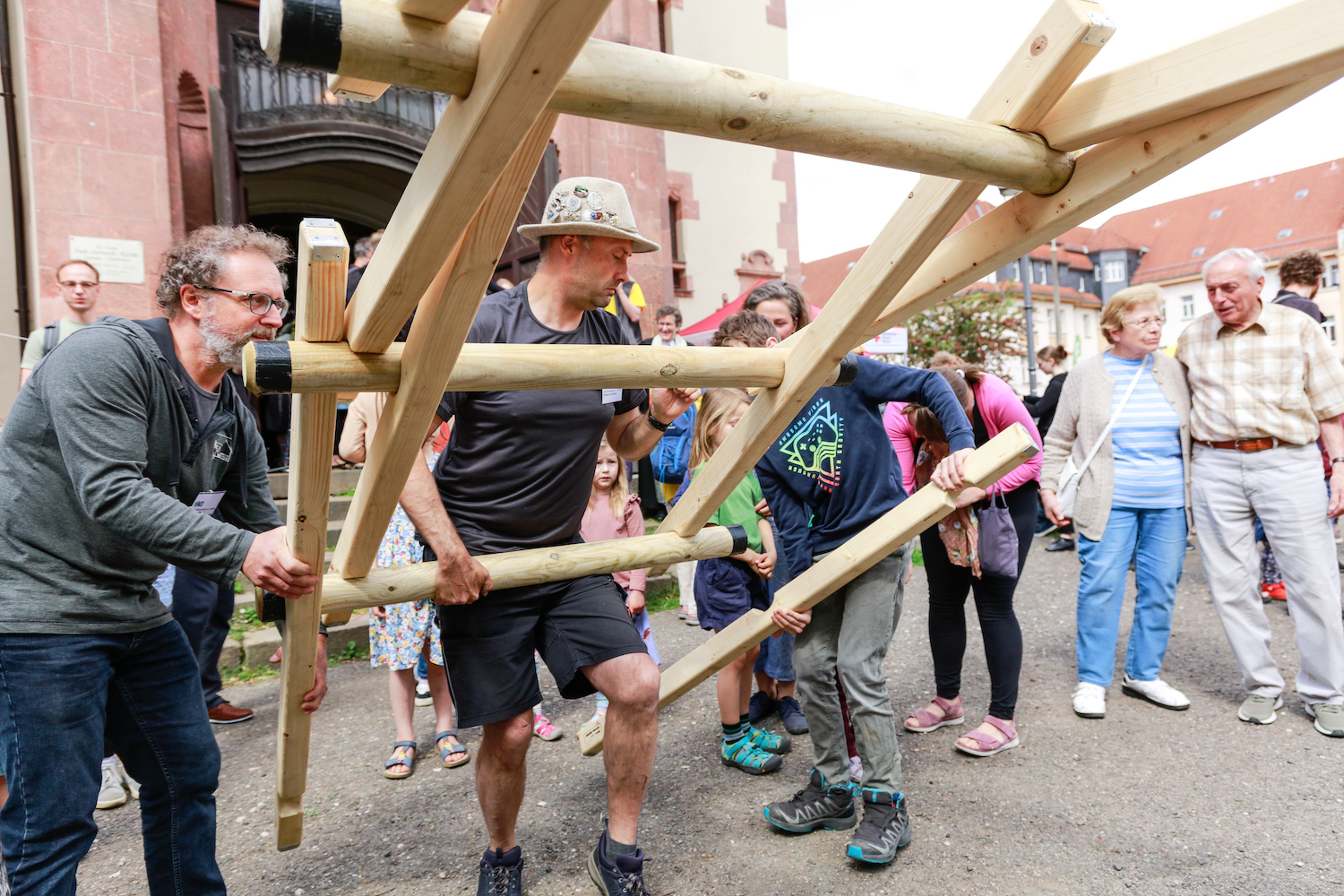 Leonardo da Vinci hatte die Pläne geliefert, gut 500 Jahre später der Verein Zukunftswerkstatt und Dietmar Schelling die Umsetzung. So entstand eine Holzbrücke ganz ohne Schrauben und Nägel gleich zu Beginn des ökumenischen Gottesdienstes im Altarraum mit immerhin 1,6 m Scheitelhöhe! Mutigen Schrittes übernahm Meusi-Chefin Rosi Mucke den Kontrollgang, die Kindergartenkinder ebenso mutigen Schrittes den späteren Holztransport auf den Kirchenvorplatz. Dort mischte sich die zahlreiche Gottesdienstgemeinde in die große Schar derer, die schon Stände auf Kirchenvorplatz und Selneckerstraße erkundeten oder der Eröffnung des Programms auf der Bühne harrten.