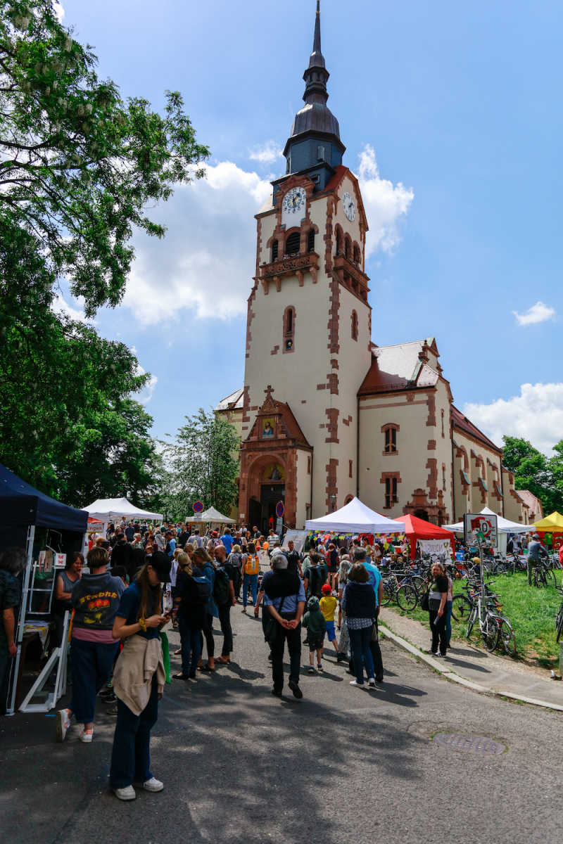 Endlich wieder!! war der mit Sicherheit am häufigsten verwendete Ausspruch auf dem Fest. Es mischten sich Fröhlichkeit und Begeisterung mit unglaublicher Gelassenheit und Entspanntheit, Freude und Dankbarkeit unter all die tausenden Gäste auf dem Fest. Viele haben die ‘verlorenen’ beiden Jahre ausgeblendet, denn es war (fast) ‘wie früher’. 105 statt der früheren 140 Stände waren gemeldet, etwas größere Abstände zwischen ihnen wirkten angenehm. Vom großen Andrang war manch ein Essenstand überrumpelt, auch unsere im Kirchberg- und Caritas-Café zur Mitfinanzierung des Festes verkauften und durch Gemeindeglieder gebackenen Kuchen schon um 16.00 Uhr restlos alle. Einige Vereine hatten ihre Mitglieder noch nicht wieder für Standbetreuungen mobilisieren können.